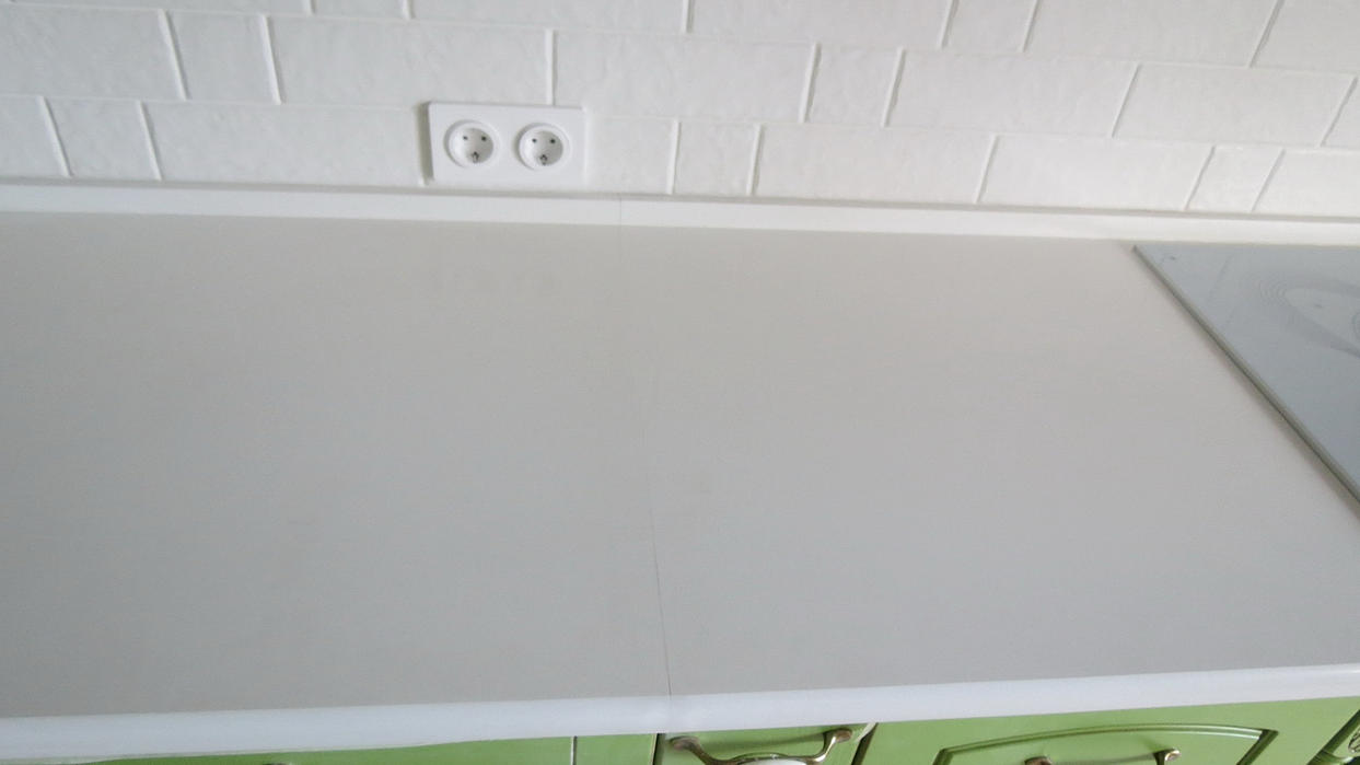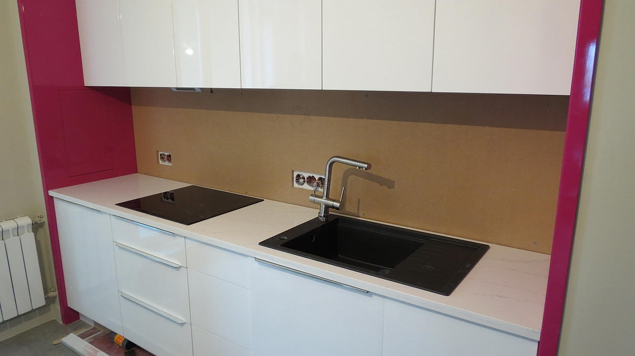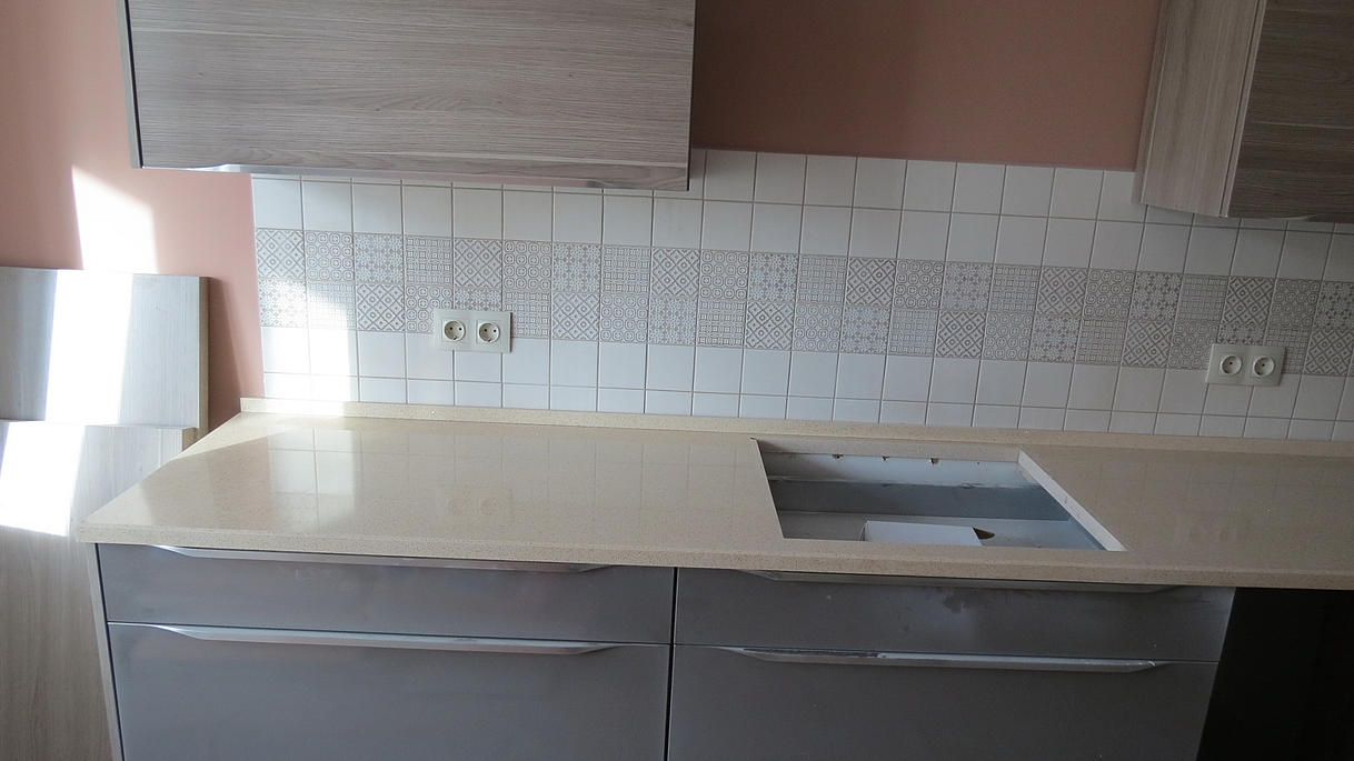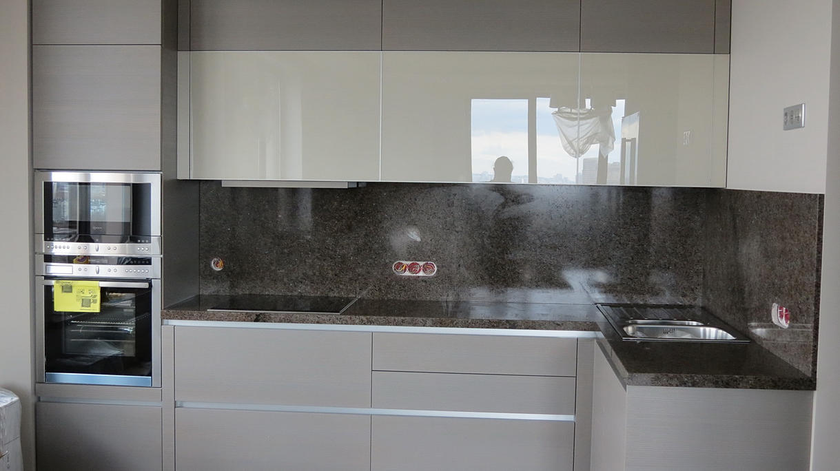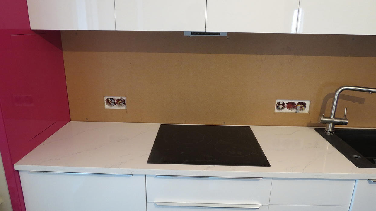 Столешница из кварцевого агломерата RU613 от компании Ханстоне. Толщина материала 30мм. Сложность заключалась в необходимости установить столешницу между 2-мя лакированными боковыми панелями. Чтобы не испортить панели, пришлось делать столешницу из 2-х частей.