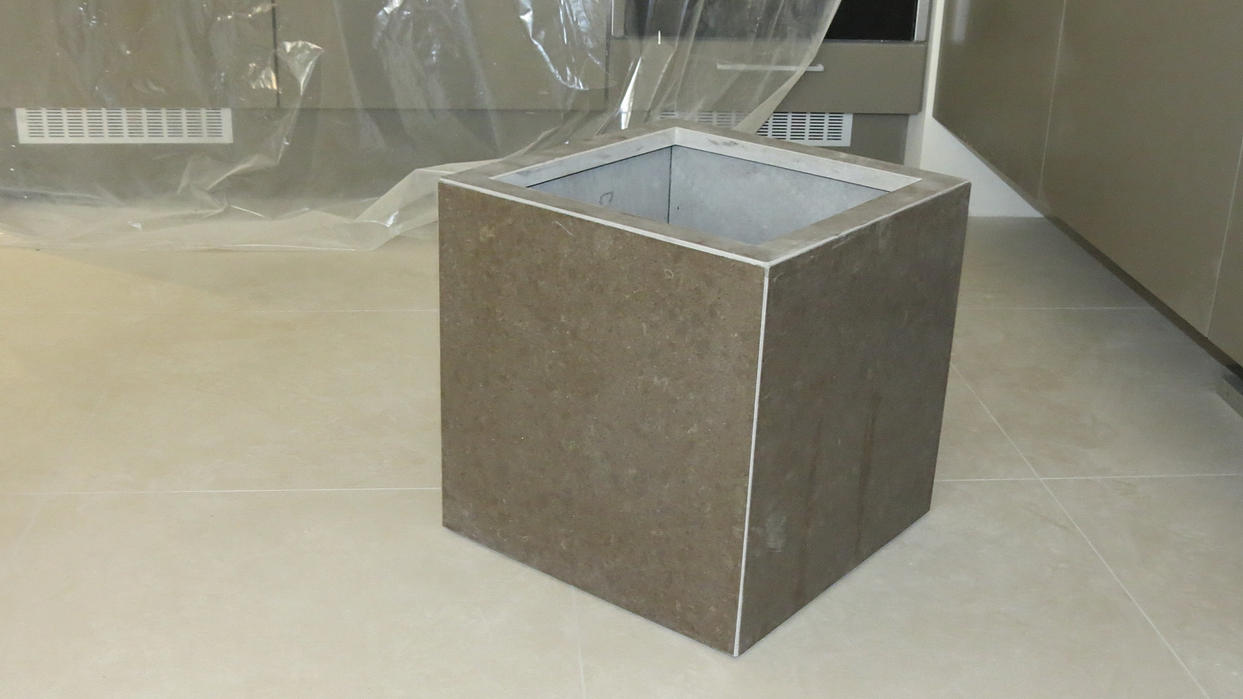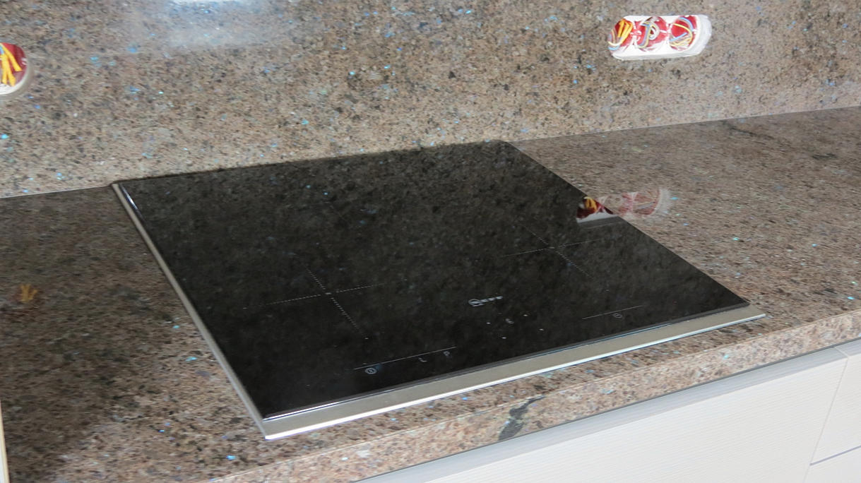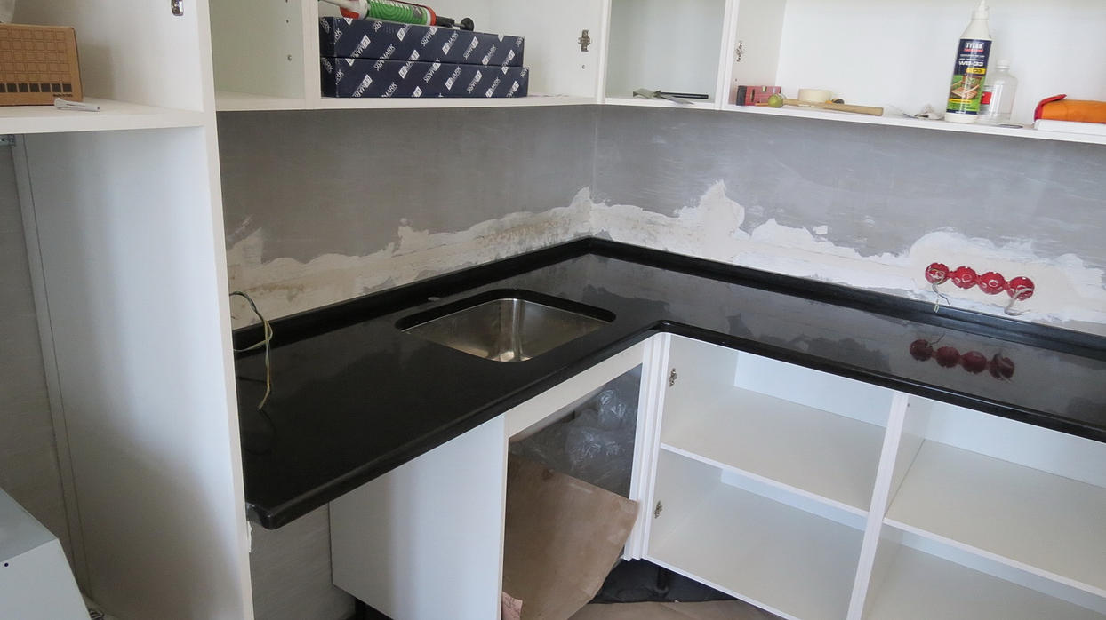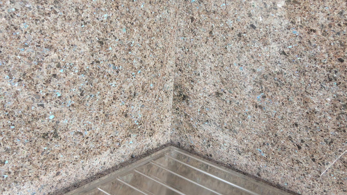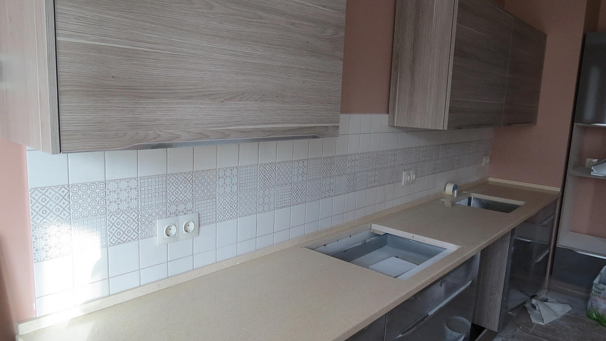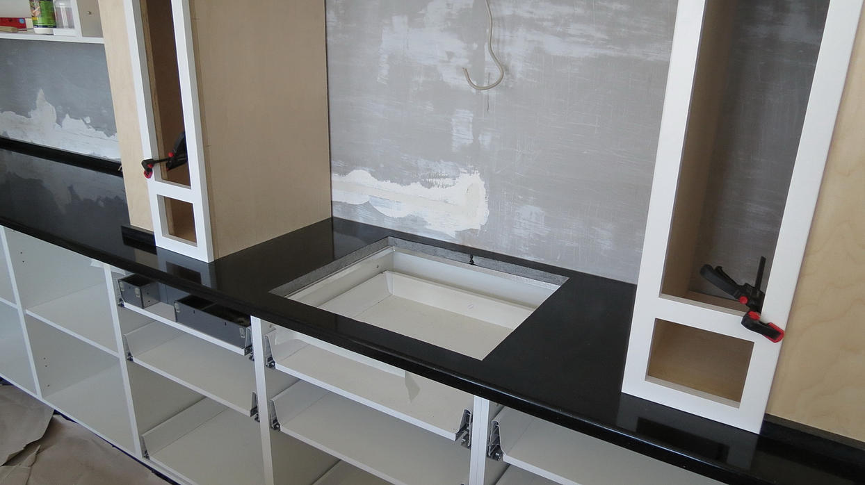 Столешница из кварцевого агломерата RU613 от компании Ханстоне. Толщина материала 30мм. Сложность заключалась в необходимости установить столешницу между 2-мя лакированными боковыми панелями. Чтобы не испортить панели, пришлось делать столешницу из 2-х частей.