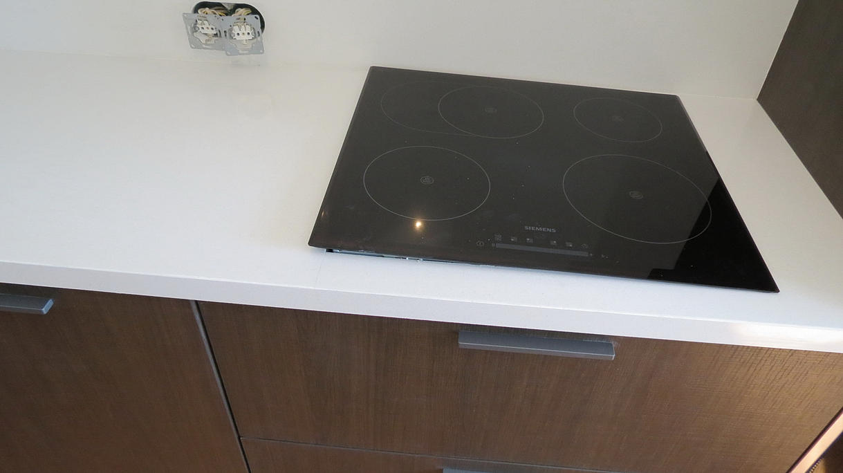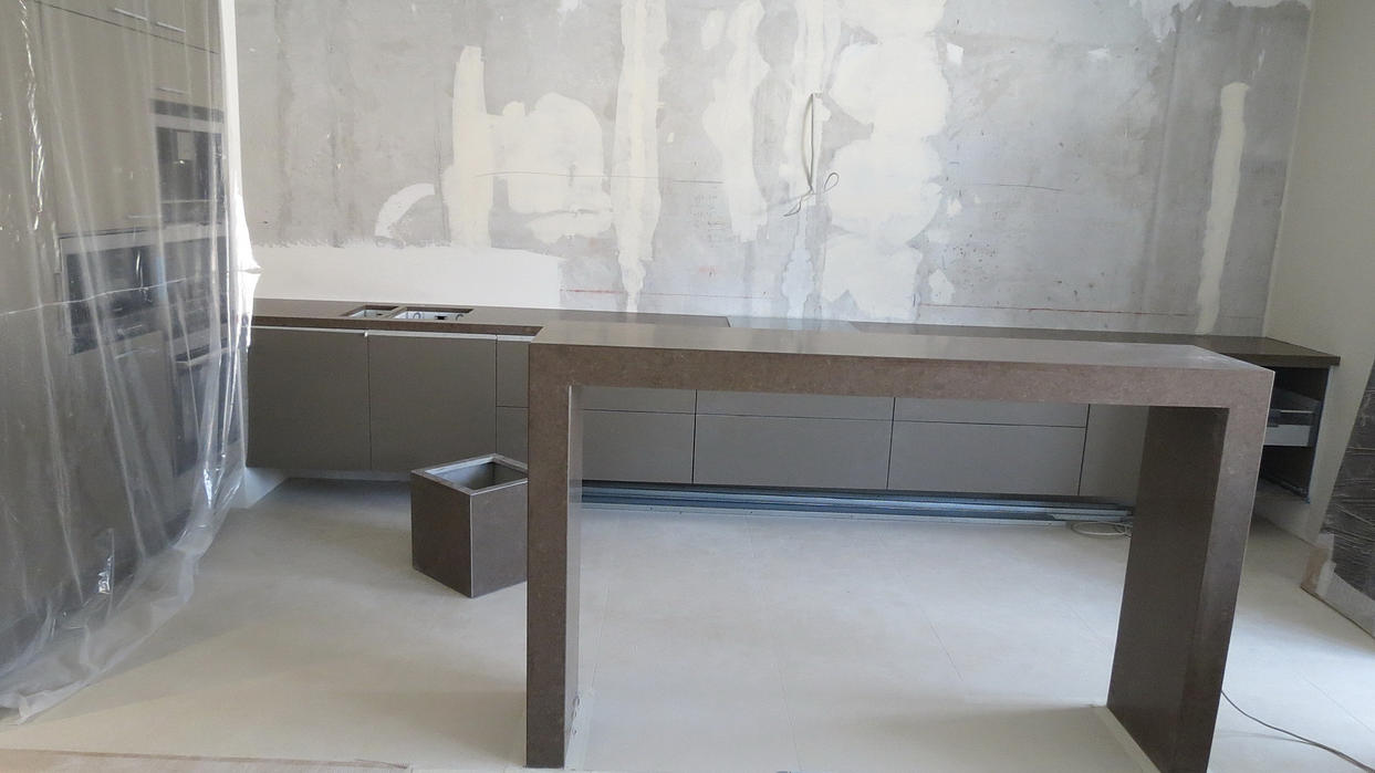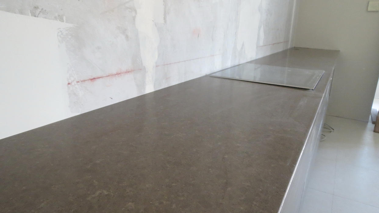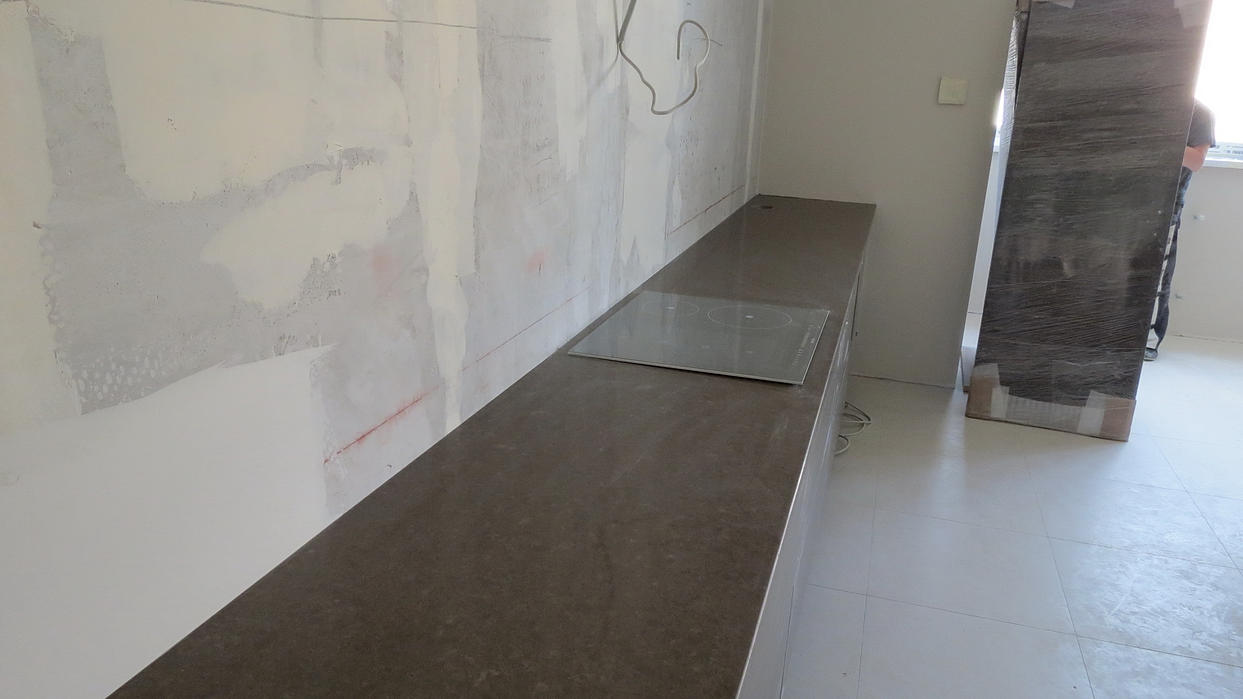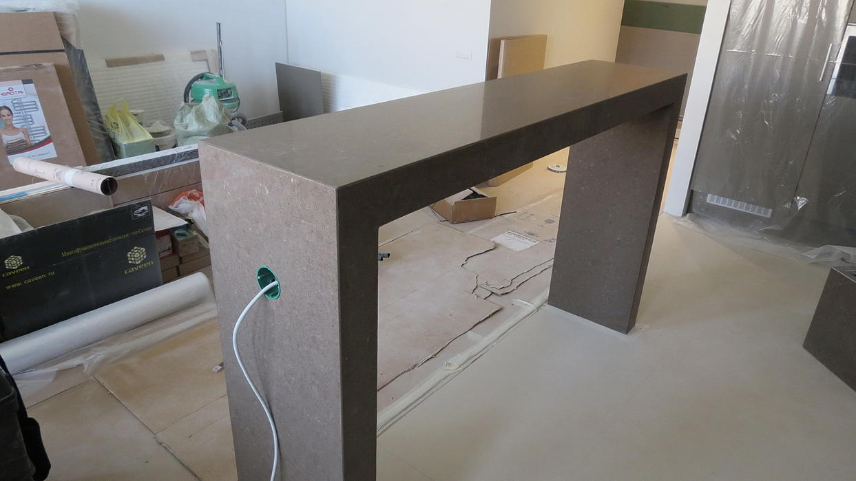 Столешница и барная стойка выполнены из кварцевого агломерата толщиной 20 мм. Кварцевый агломерат от Цезарь Стоне (Израиль). Столешница 5.5 м х 0.6м. Мойка нижняя. Видимая толщина столешницы 40мм (подклейка 45 градусов). Стыковка частей столешницы в районе варочной панели.