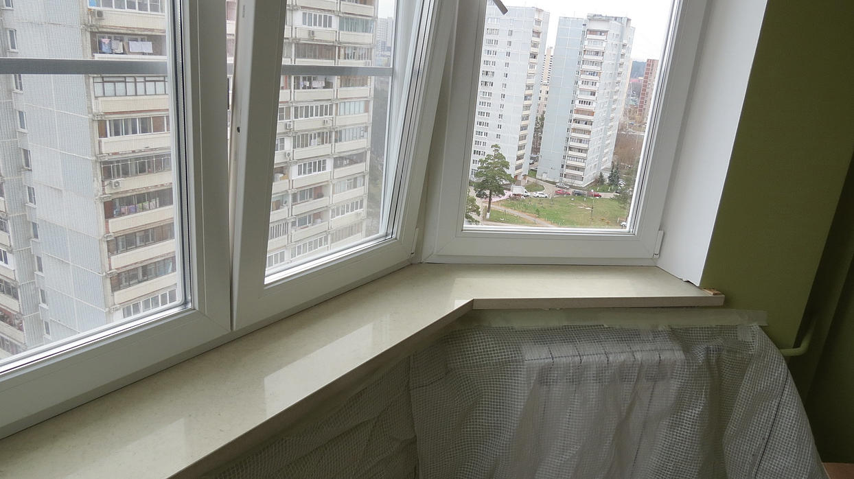 Так же был изготовлен и установлен эркерный подоконник из кварцевого агломерата Аспен. Примечательно, что материал на подоконник подобрали из остатков на производстве, что позволило сэкономить более 30000 рублей.