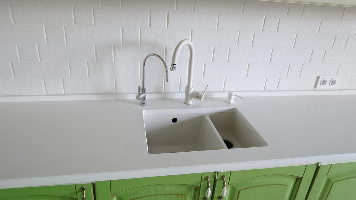 Столешница из кварцевого агломерата от компании Самсунг. Толщина материала 30мм. Габариты столешницы 2м х 3м. Мойка подстольного монтажа.