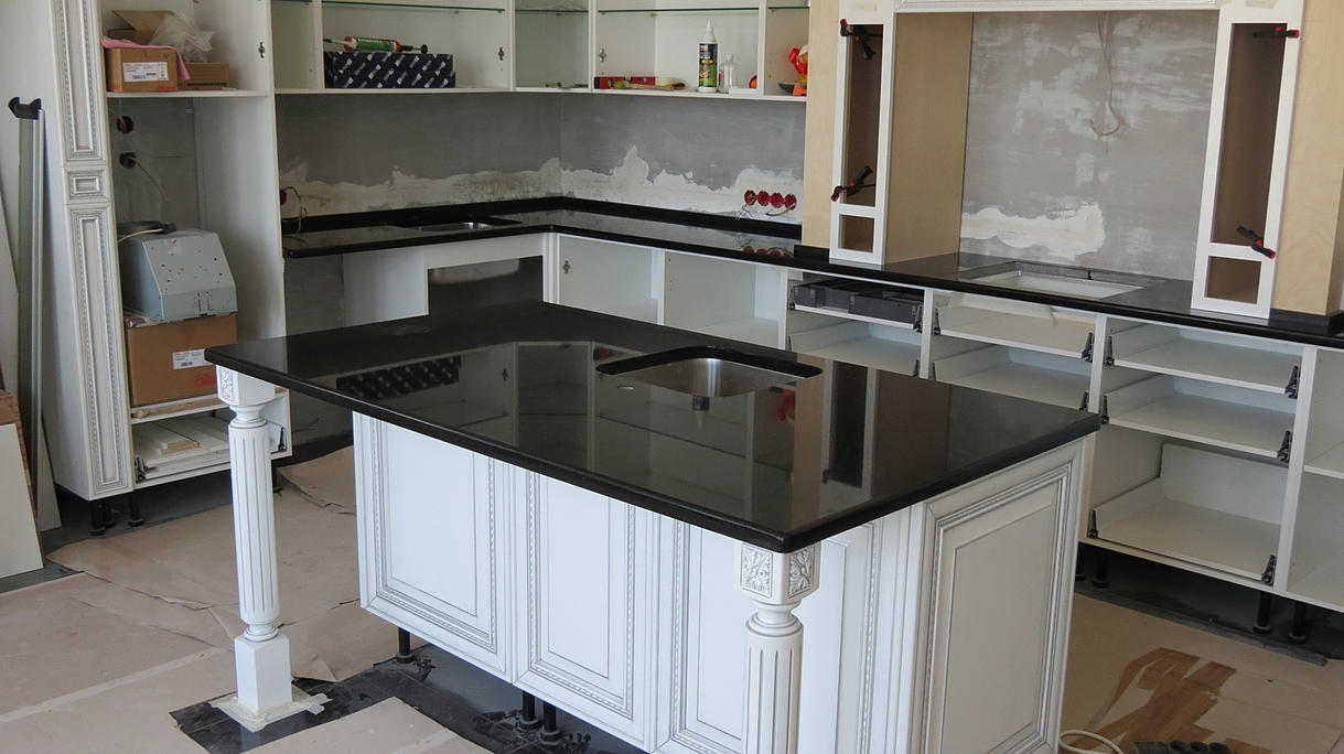 Блек Гелакси На Новой Риге. Столешница с плинтусом и остров из гранита Блек Гелакси. Мойки с подстольным монтажом. Размер столешницы 1,8м х 3,6м. Размекр Острова 1,8м х 1м.