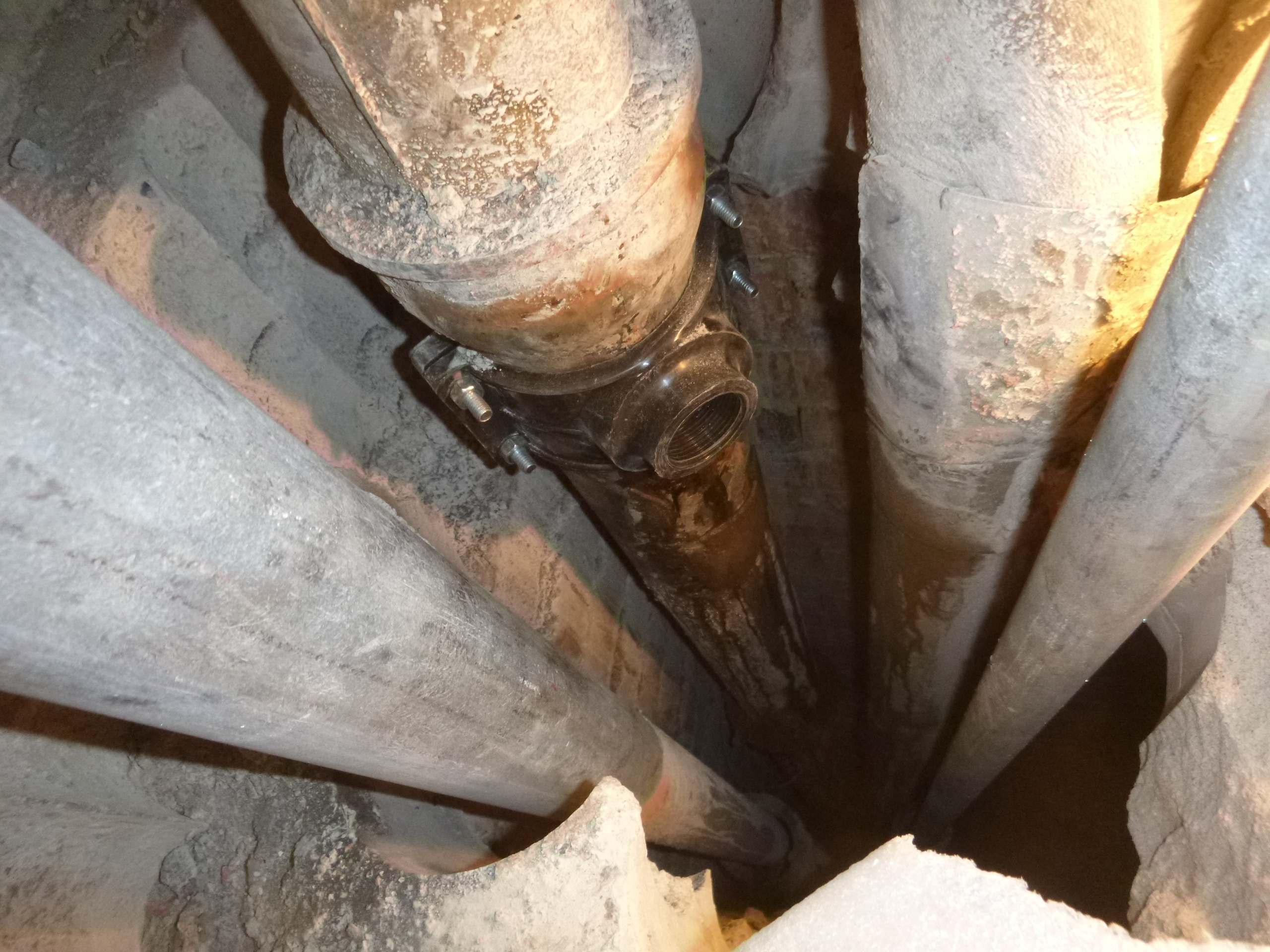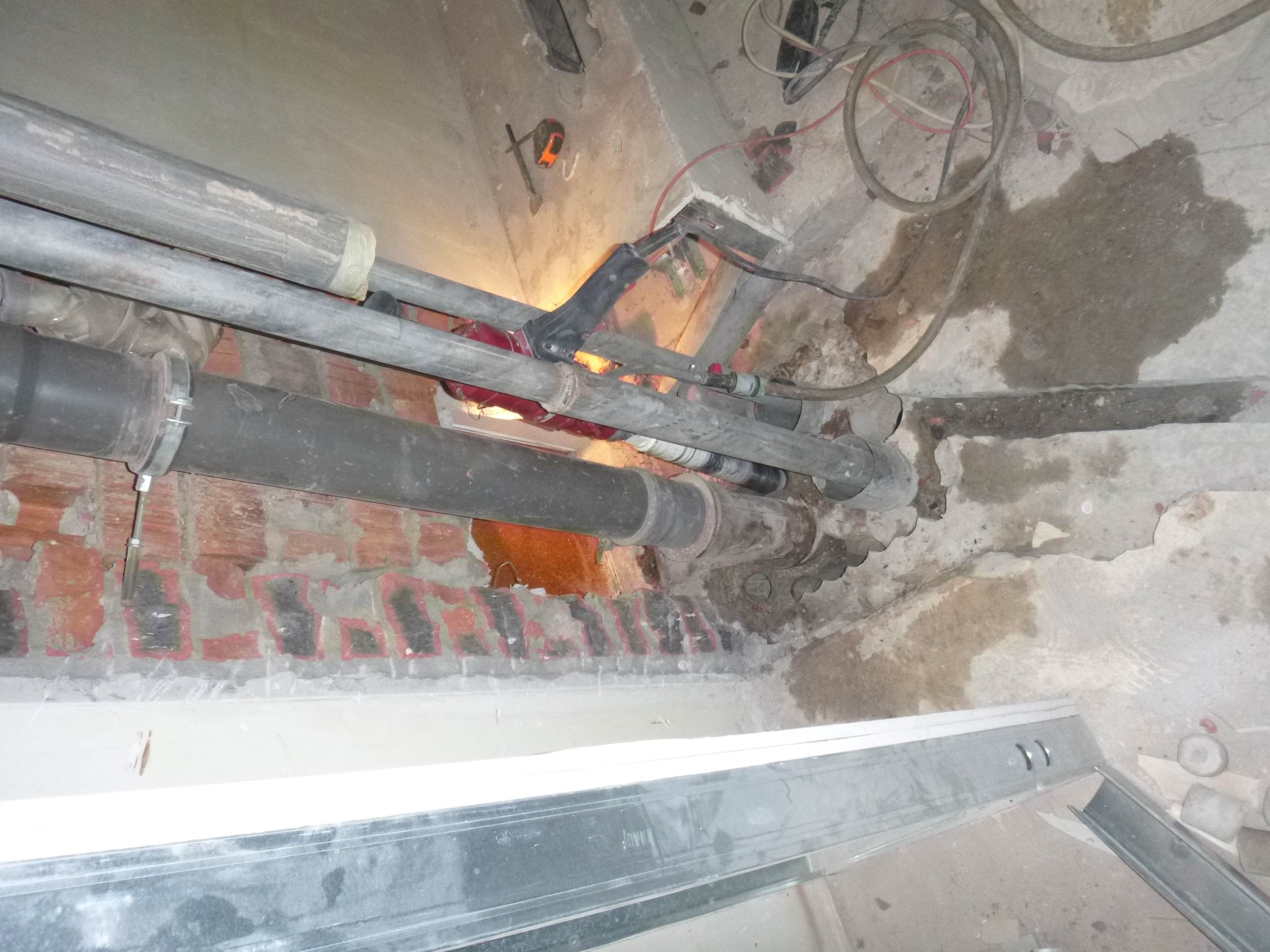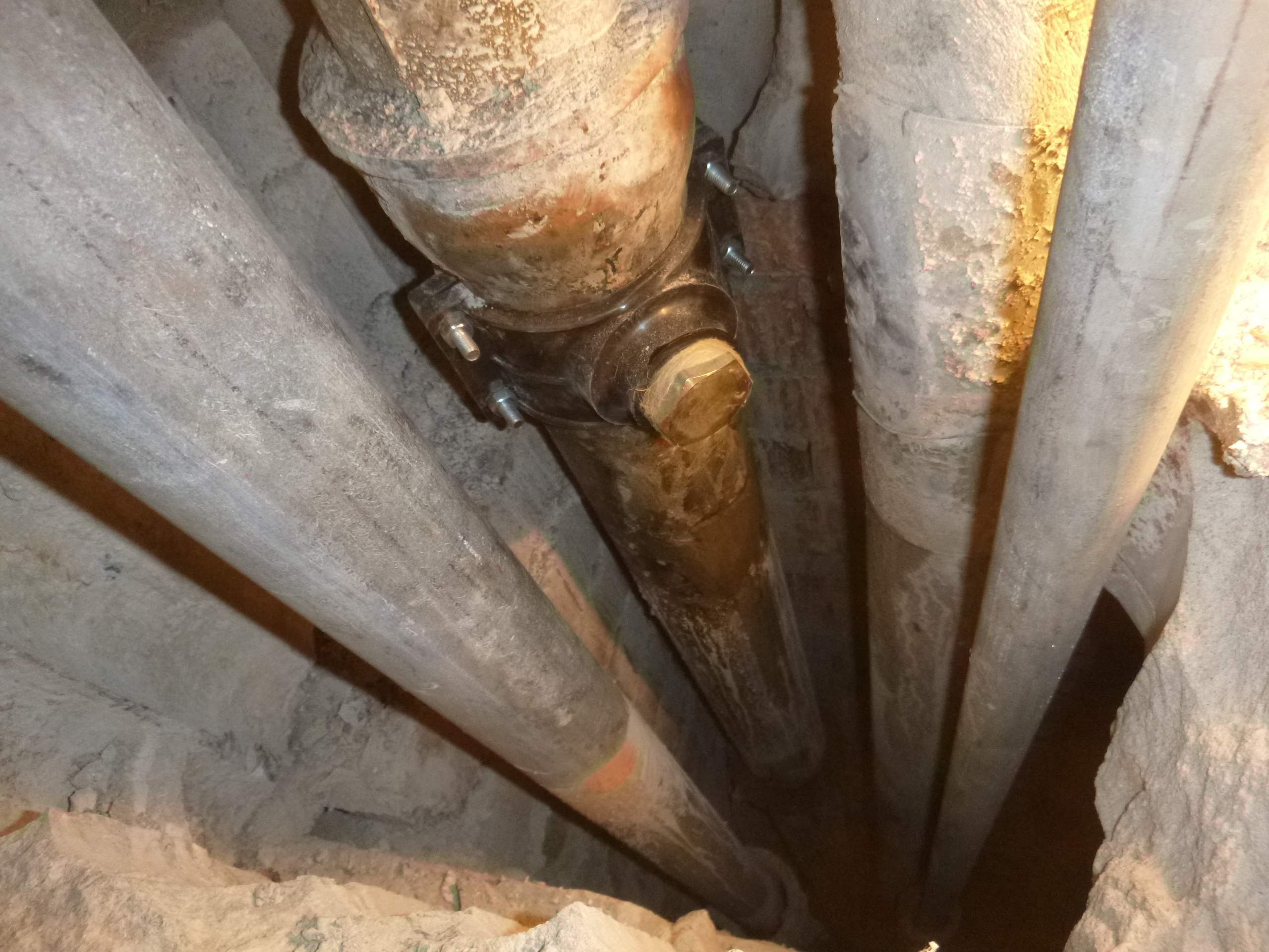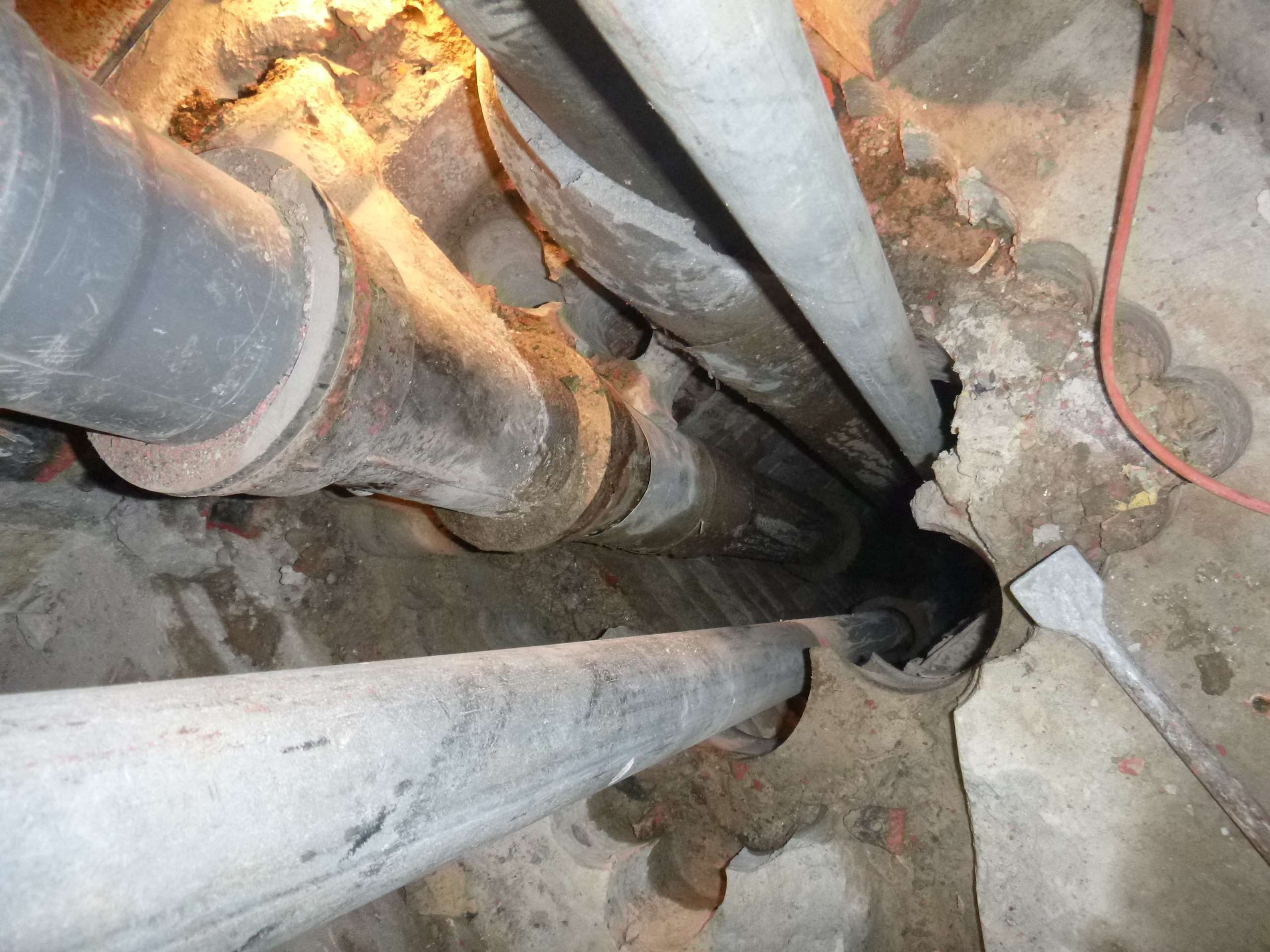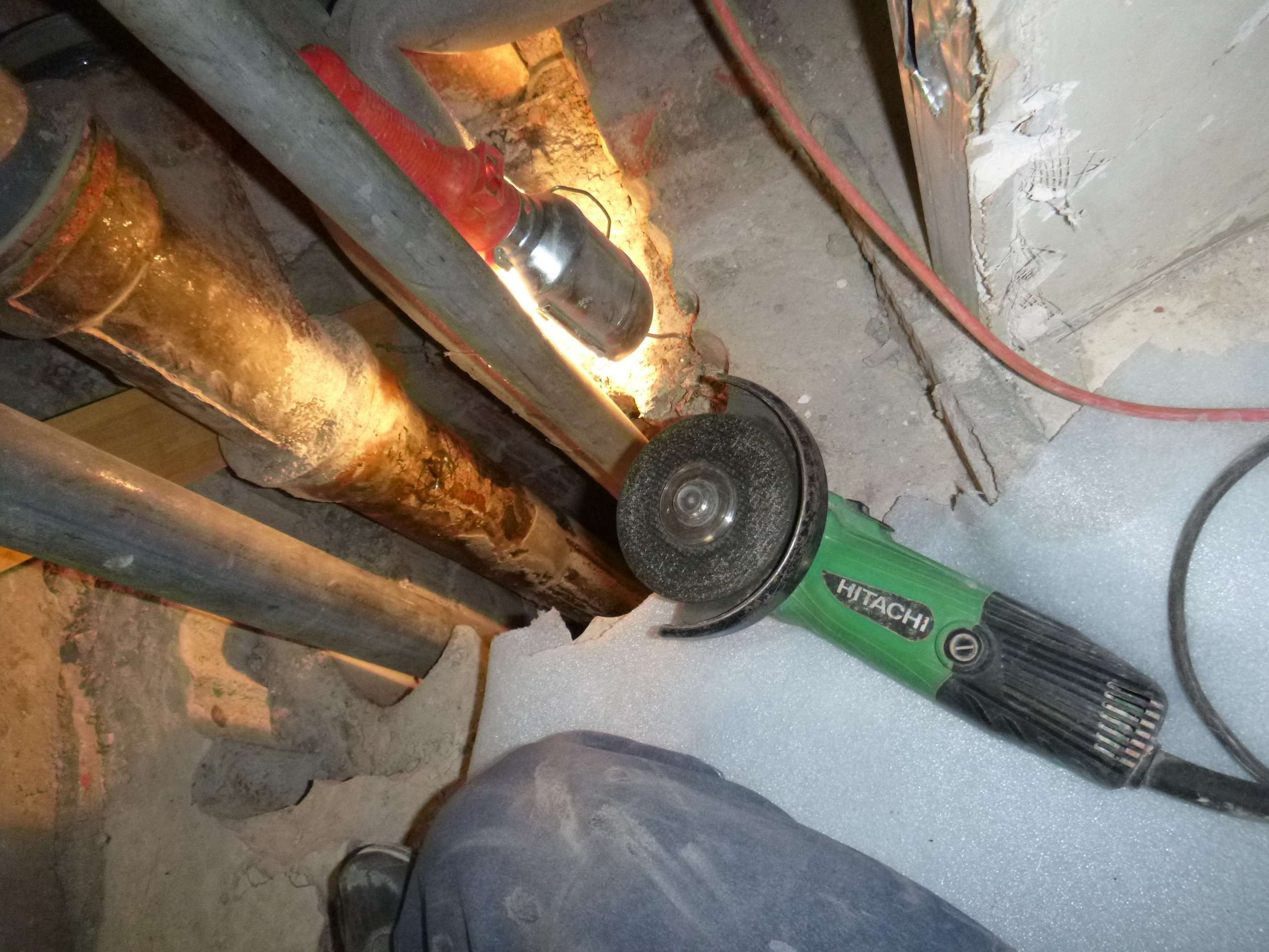Возникла необходимость врезаться в чугунный стояк канализации,на уровне ниже своего пола,доступа снизу нет,по старым отверстиям расверлив каждое,оголил трубу и врезался.