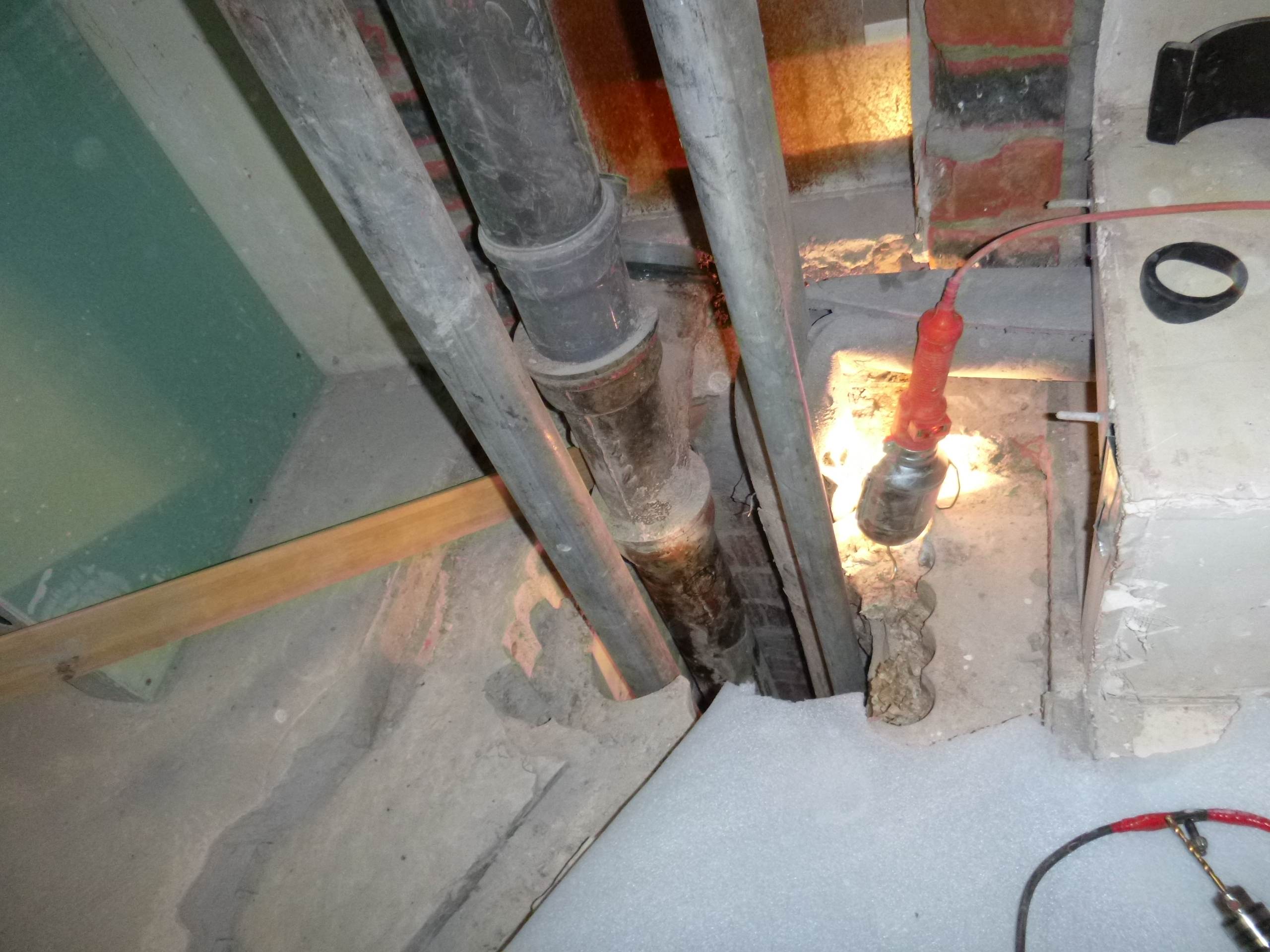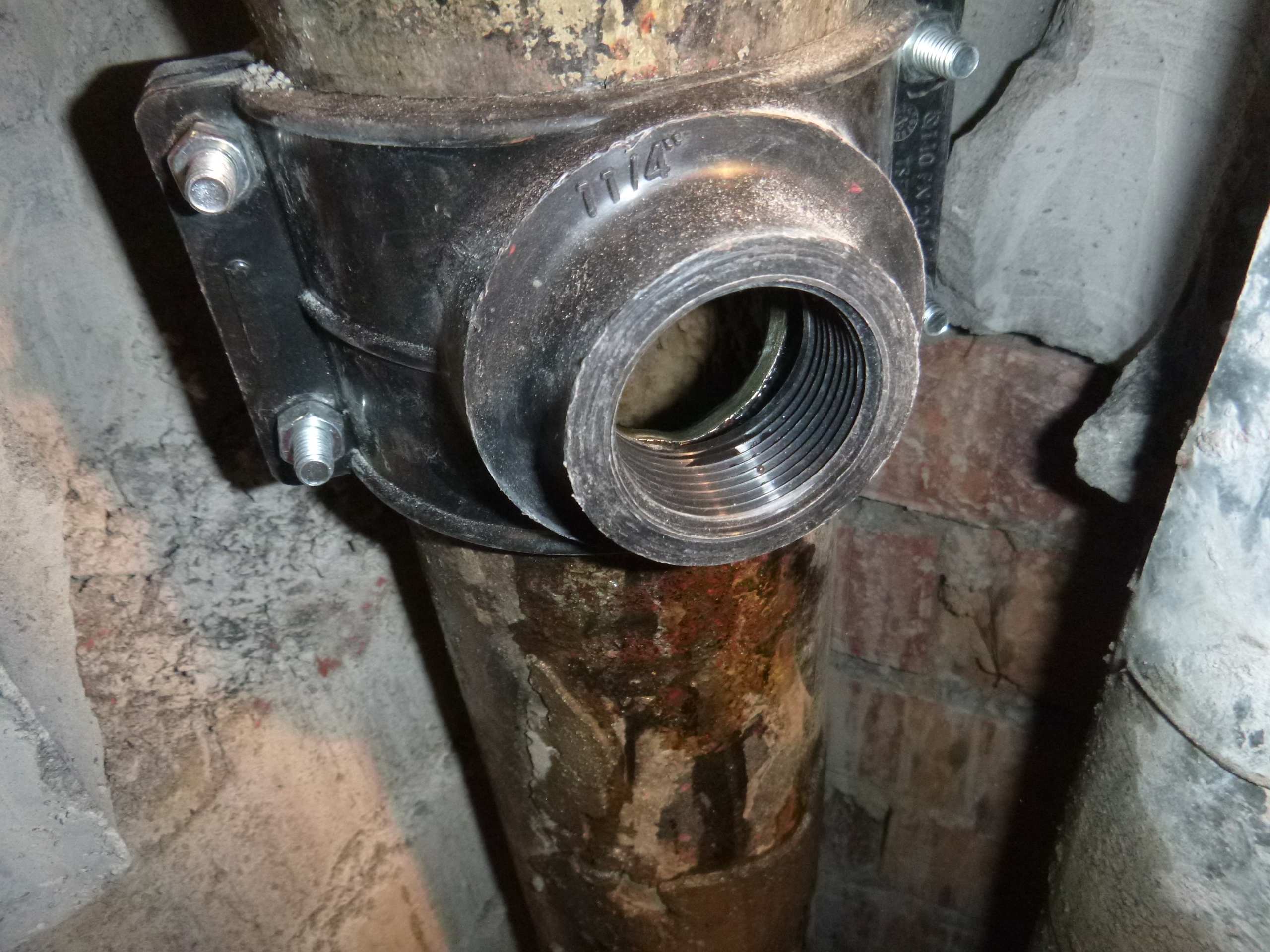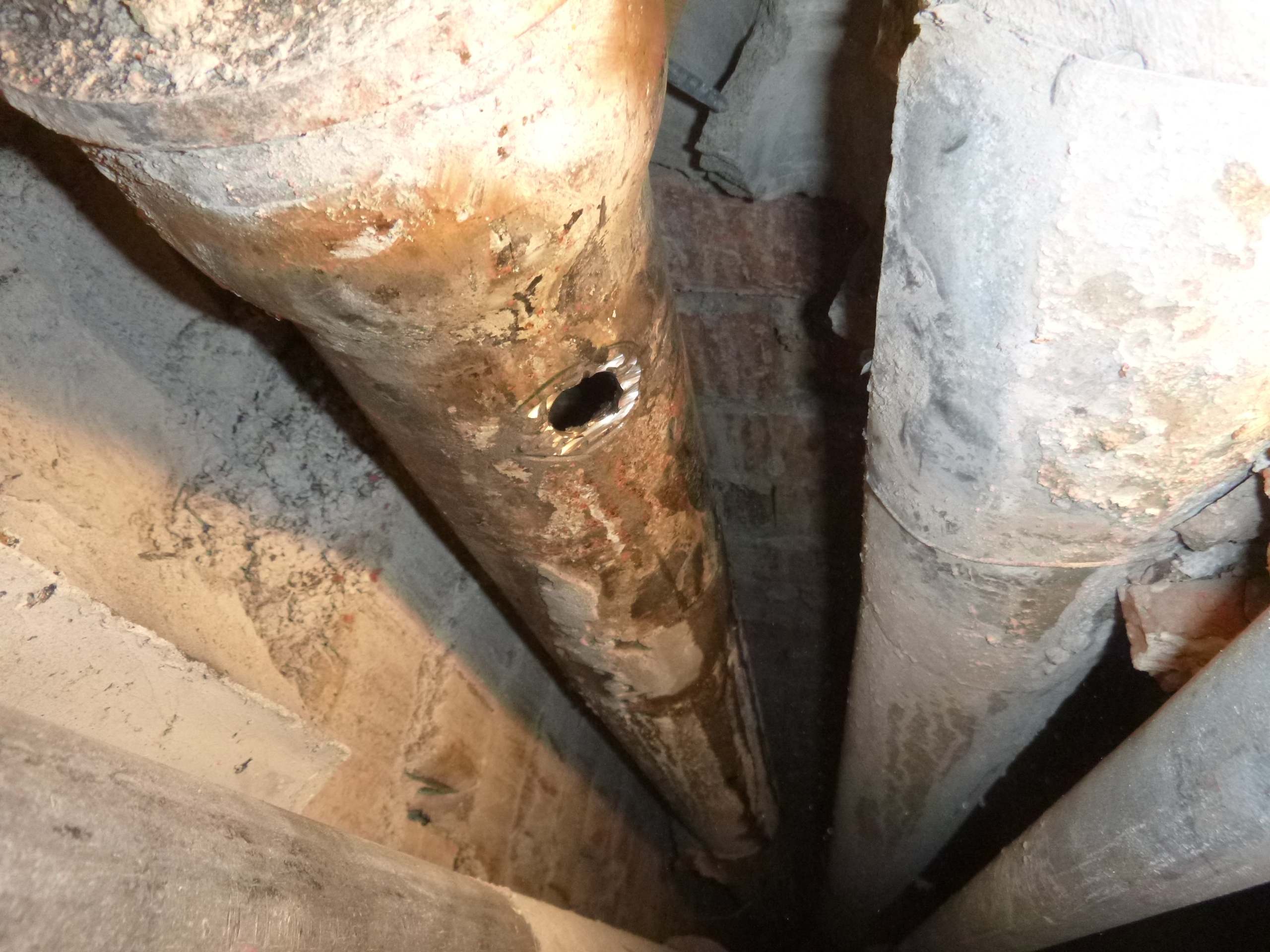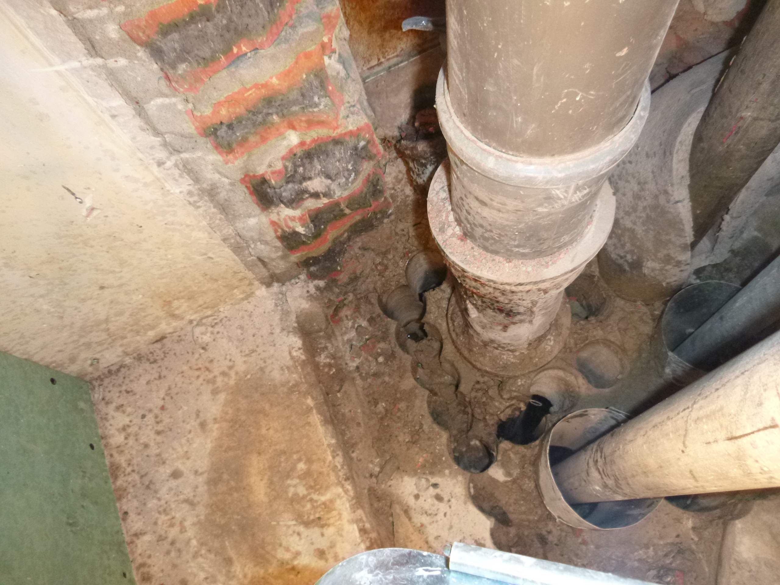 Возникла необходимость врезаться в чугунный стояк канализации,на уровне ниже своего пола,доступа снизу нет,по старым отверстиям расверлив каждое,оголил трубу и врезался.