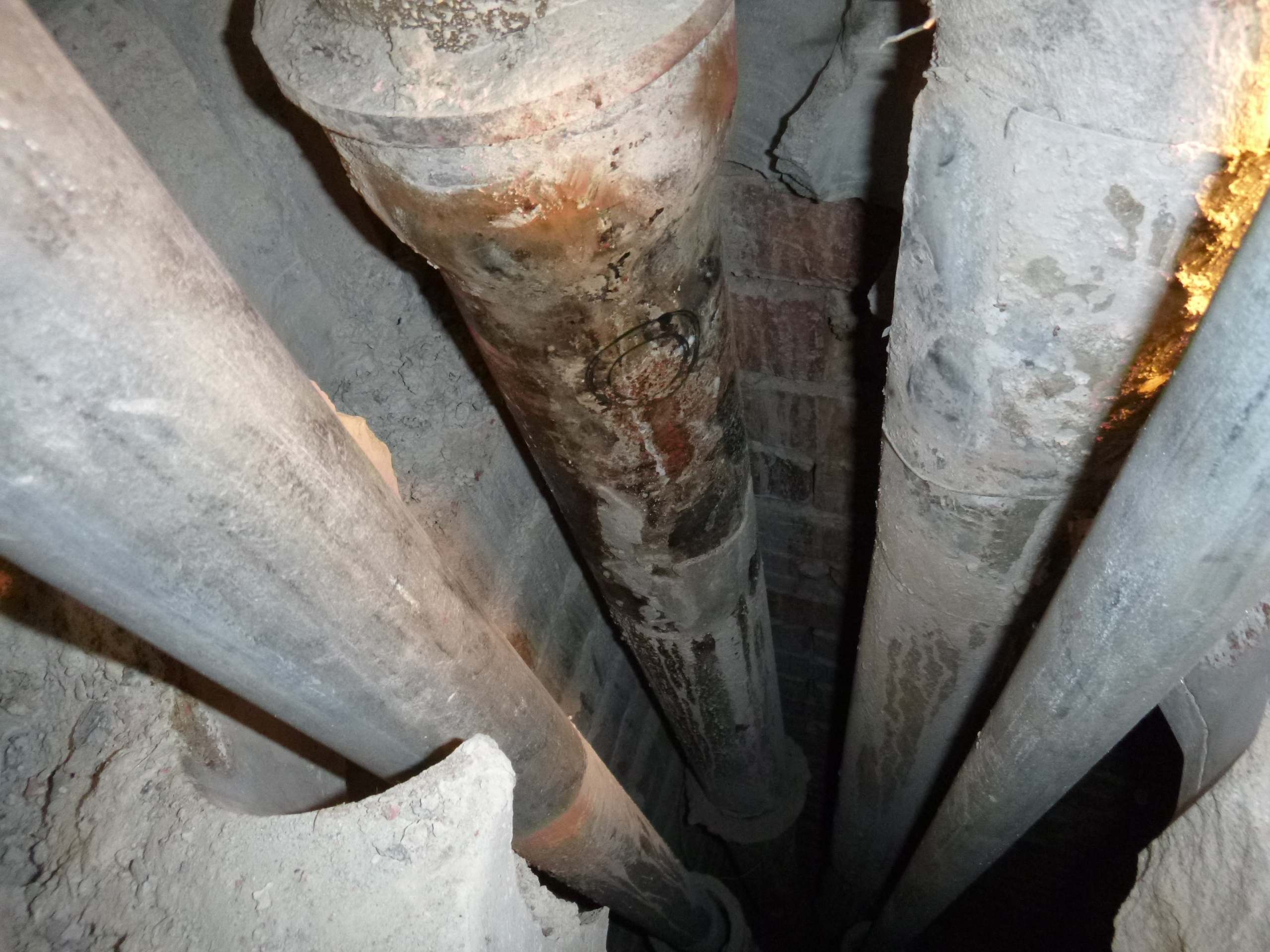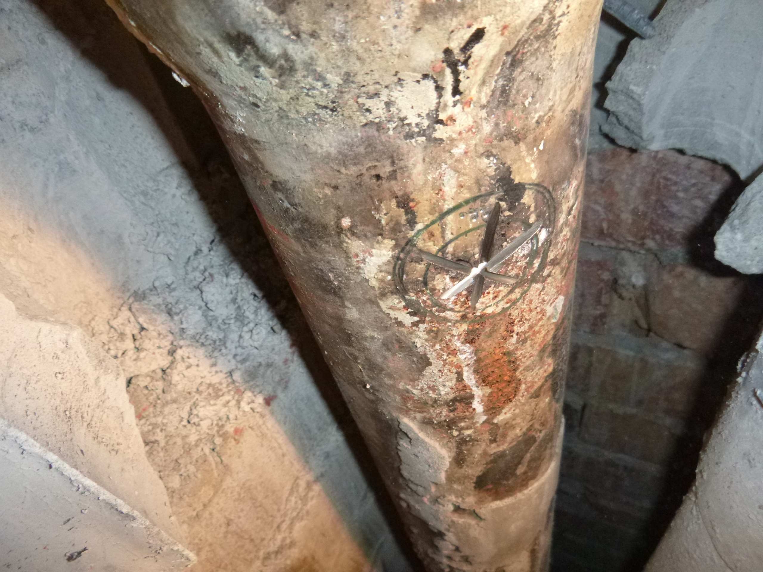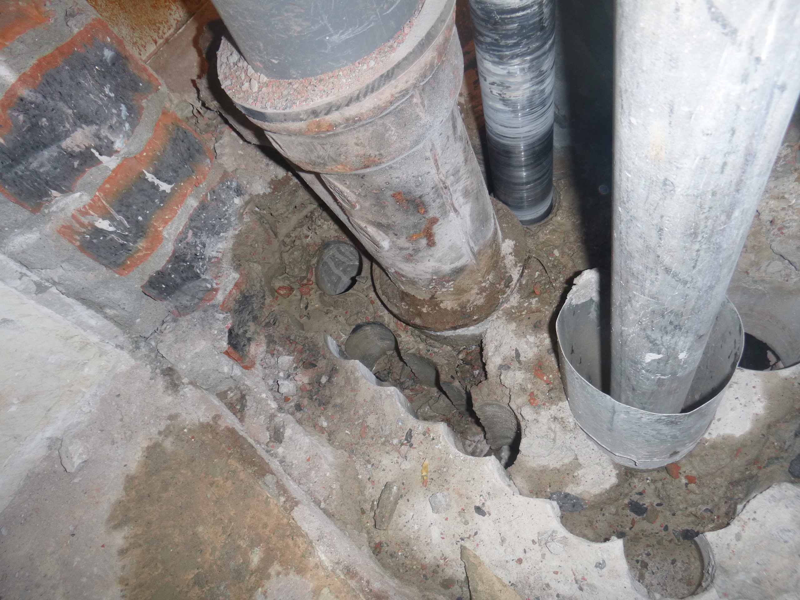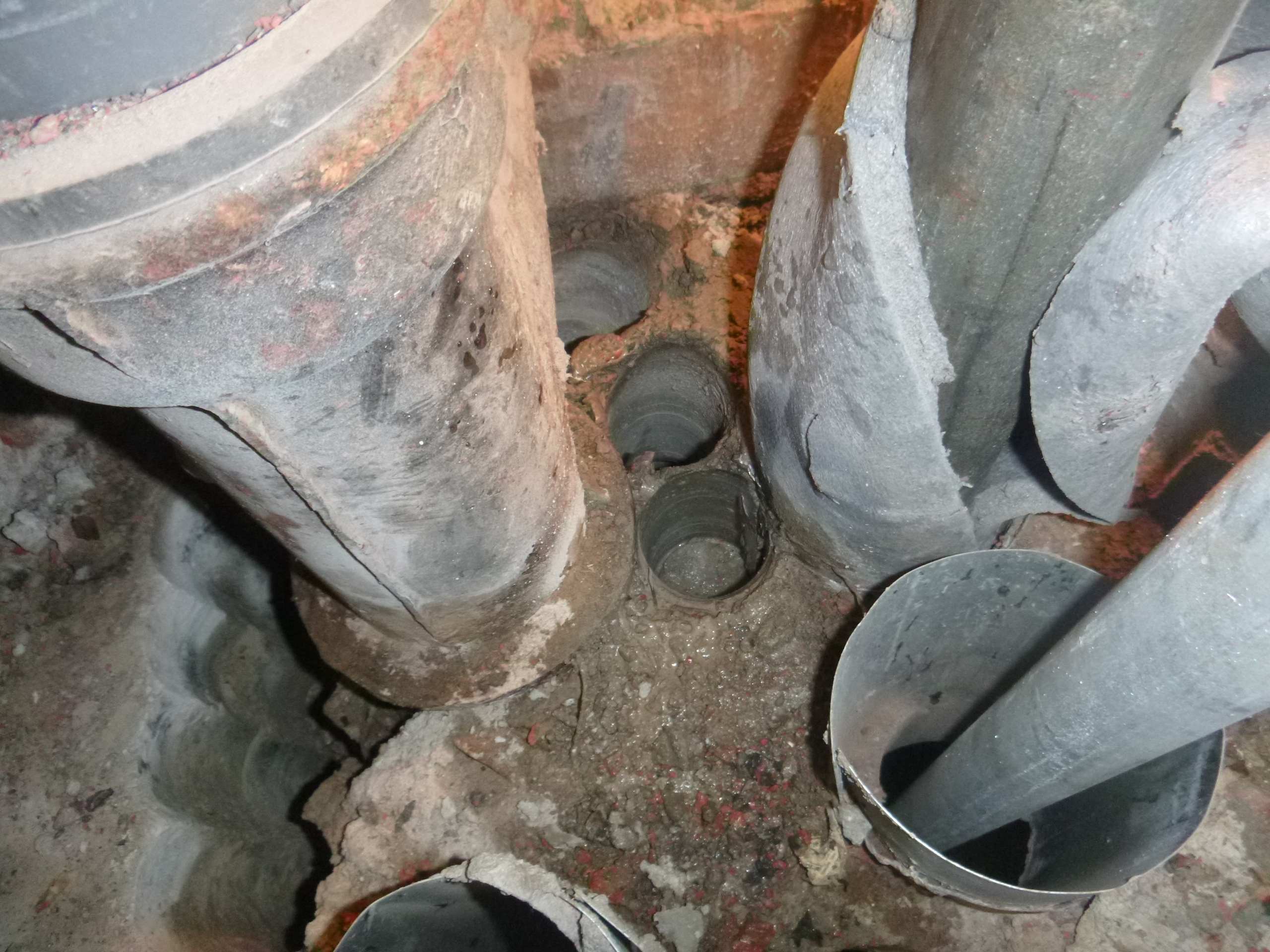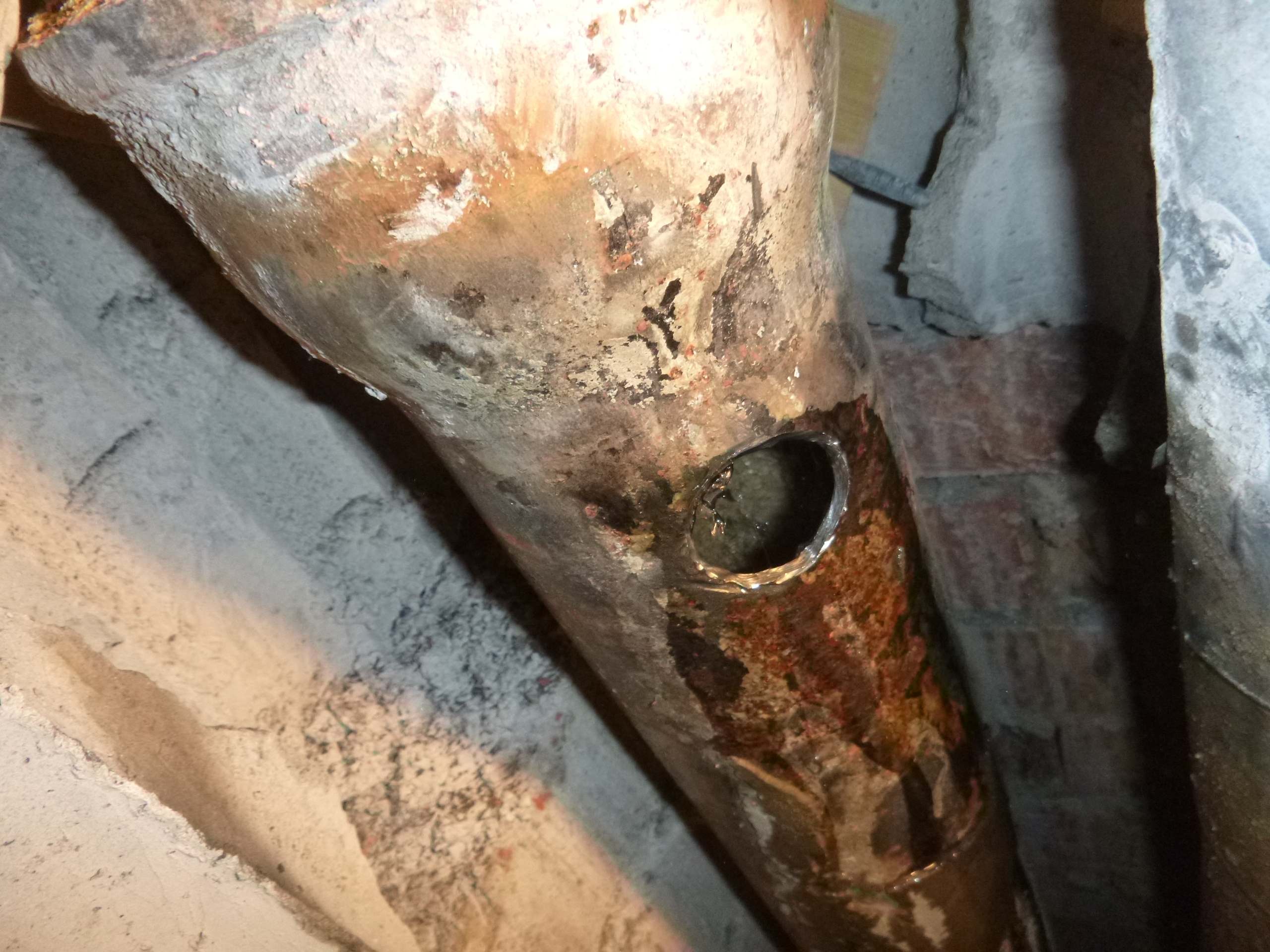 Возникла необходимость врезаться в чугунный стояк канализации,на уровне ниже своего пола,доступа снизу нет,по старым отверстиям расверлив каждое,оголил трубу и врезался.