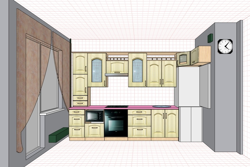 Набросал проект. Не нравится (жене). Рядом с холодильником - сразу раковина, неудобно выгружать продукты; слишком просто, не интересно...