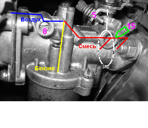 Винт 8 регулировки воздуха даёт качество смеси, т.е обогащение