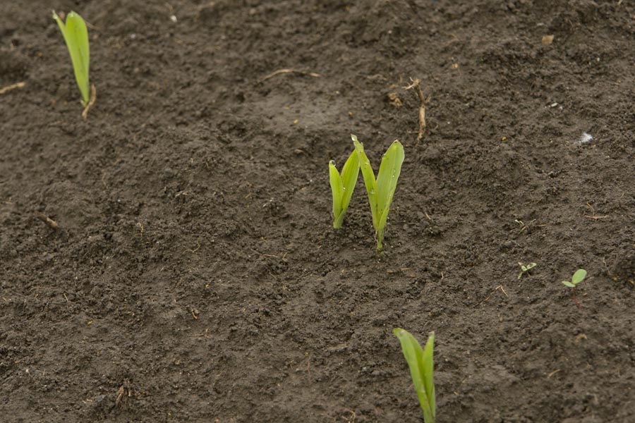 Планировалось в конце мая небольшое окучивание кукурузы и фасоли перед летними ливнями. Фасоль ещё не взошла, рядов не видно. Возможно, попробую делать технологические борозды в междурядье и рыхление ёжиками без вставки.