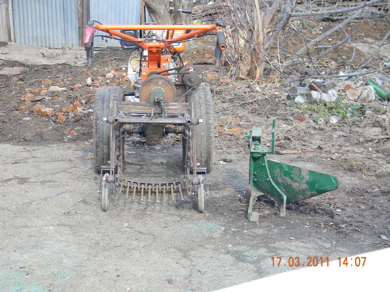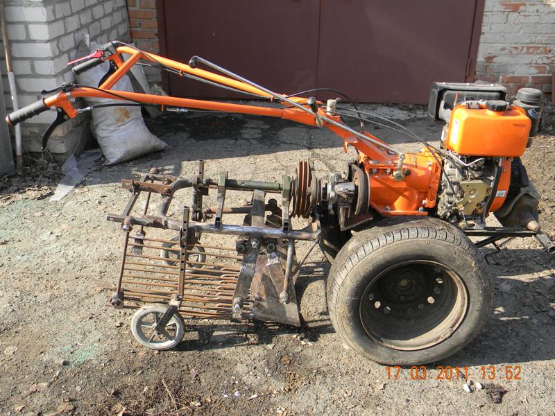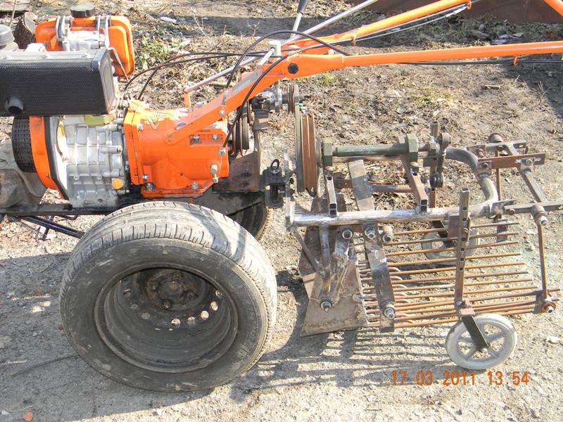 Заглубится как надо ( регулировка опорными колесами). В случай чего поставлю колеса на МБ менше . А вообще такие копалки как правило используются для срезания терекон. Углубляются от уровня колеса на 5 - 7 см. еще не испробывал на грунте, а мелкие кирпичи по грохоту, ползут куда надо. В основном обрабатываю не большие участки , да в один проход. Чертежи не использовал. Как по мне , для разового производства они не нужны, немного поработал в своей мастерской. Все , что из размеров использовал , это захват 360 мм. Остальное опытным путем и по фото , видио. Гнуть приводной гемень не хотелось, истользовал помпу от Москвича.