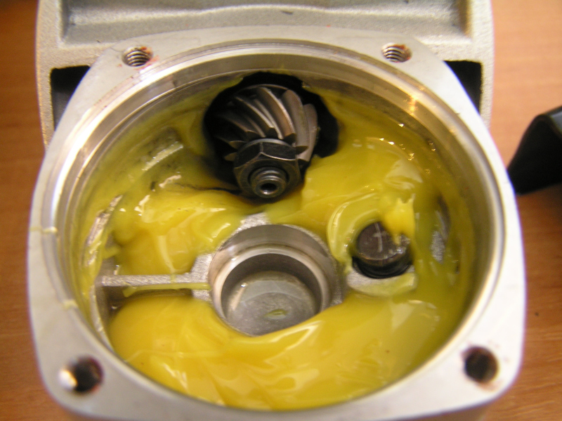 как и ожидалось косые зубья, быстросменная защита, подшипник в пятке и виброрукоять (на фото видна массивная пробка-заглушка рукояти). Вопрос: а смазки не маловато или она прогреется и растечется по шестерням ?