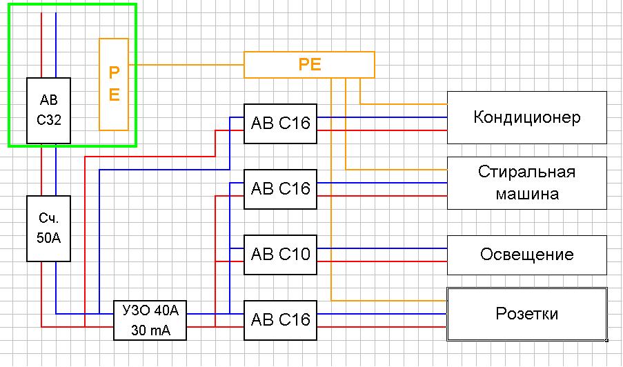 Плюс автомат на водогрей, + на линию на кухню, + отдельное УЗО 10мА на СМ (когда-нибудь) :)