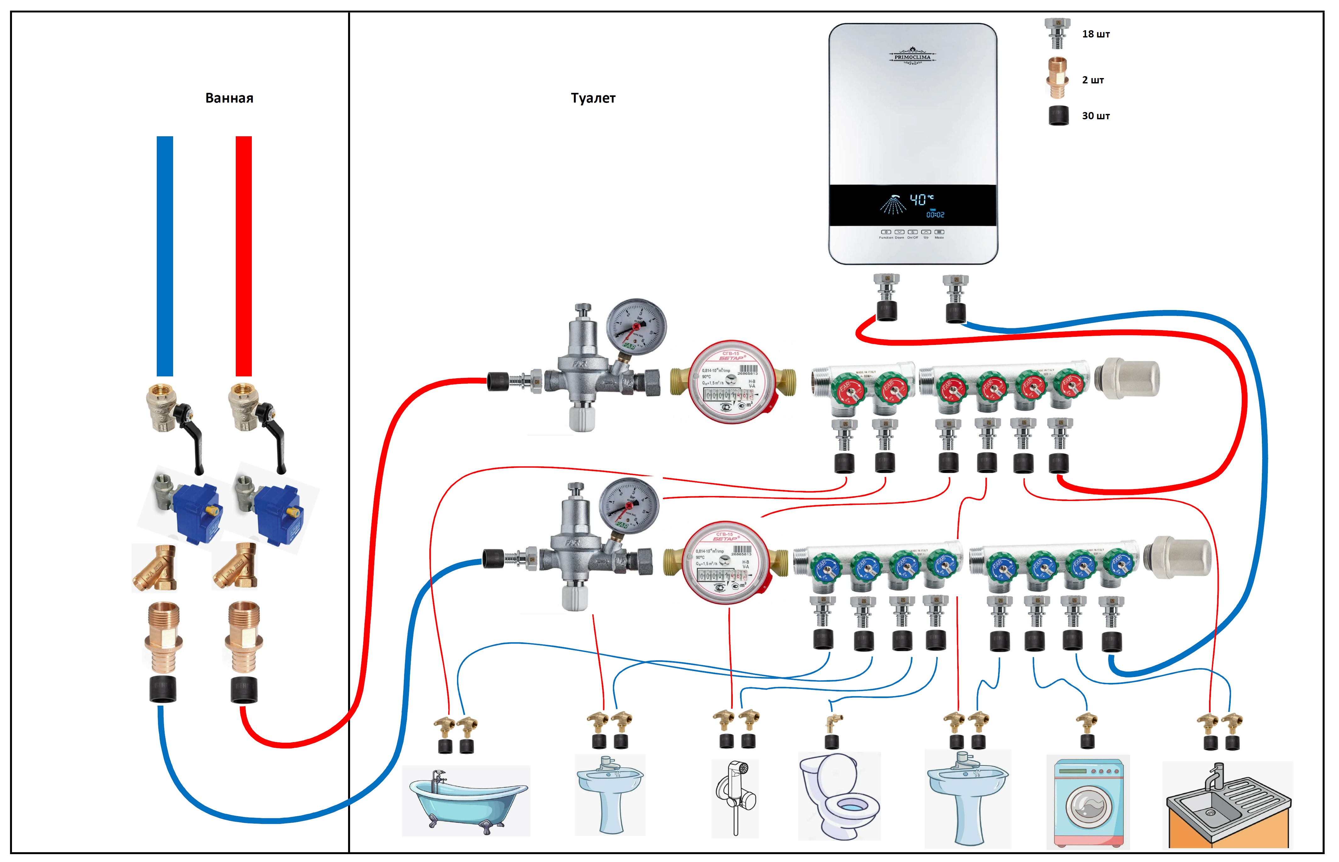 Я со стояков в ванной буду перекидывать в туалет, а там уже коллекторная группа.